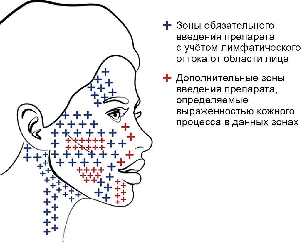 Препарат Hyalual 1,1% вводят в технике интрадермальных папульных инъекций по линиям, соответствующим лимфооттоку от области лица и локализации кожного процесса (рис. 3). Курс состоит из трёх процедур, проводимых с интервалом 2 нед, и последующих регулярных процедур, выполняемых 1 раз в 2 мес.