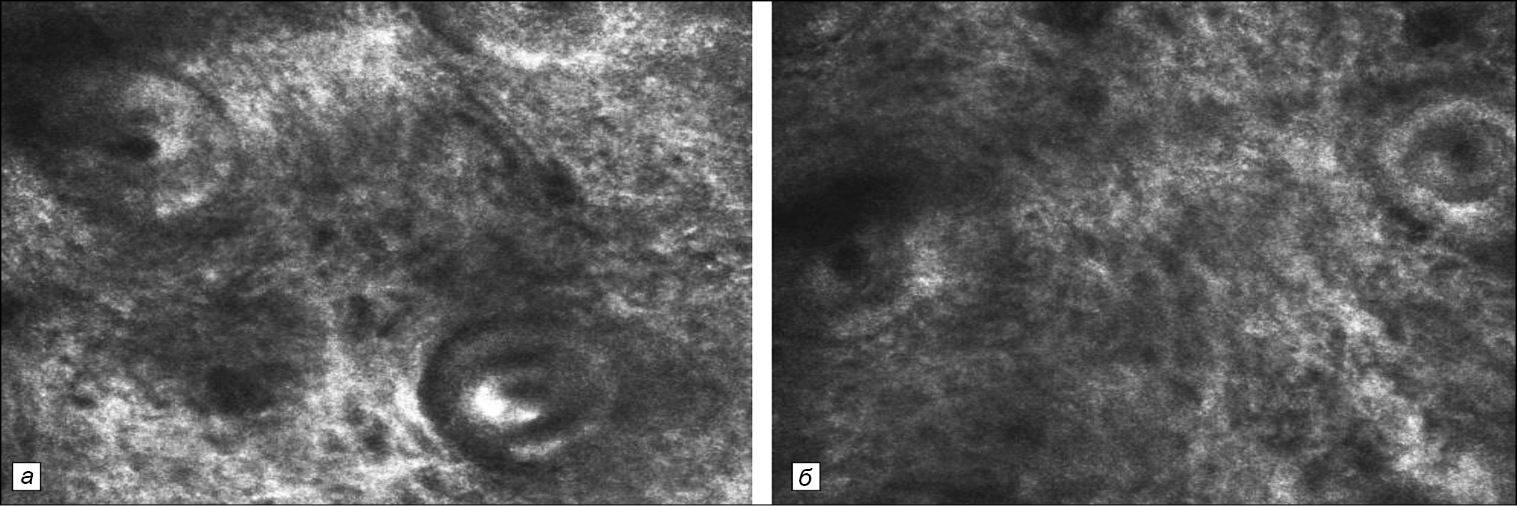 Рис. 5. Та же больная. Конфокальная лазерная сканирующая микроскопия. а – до курса редермализации: определяются значительно расширенные, горизонтально расположенные сосуды, изменения структуры каркаса дермы в виде участков разрежения её структур; б – после курса трансдермальной редермализации: наблюдается выраженное сужение ранее расширенных сосудов, как самых мелких, так и более крупных, в том числе в зоне сосочков дермы. Общая структура верхней дермы приобрела более однородный структурированный вид с нормальным расположением волокон и сосудов.