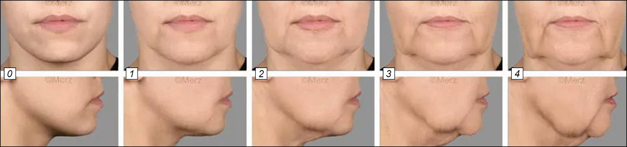 Рис. 1. Визуальная шкала старения Мерц: 0 – нет провисания нижней челюсти; 1 – небольшое провисание линии нижней челюсти; 2 – умеренное провисание линии нижней челюсти; 3 – выраженное провисание линии нижней челюсти; 4 – значительное провисание линии нижней челюсти [30, 33].