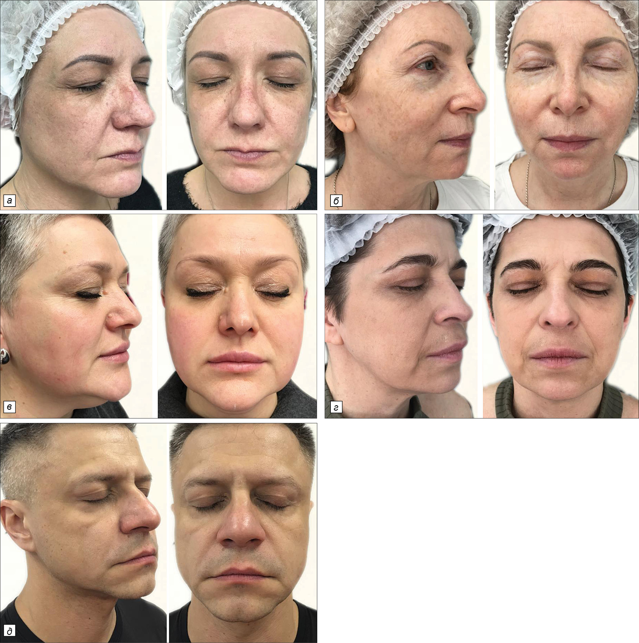 Рис. 2. Морфотипы старения. а – усталый тип старения; б – мелкоморщинистый тип старения; в – деформационный тип старения; г – смешанный тип старения; д – мускульный тип старения.