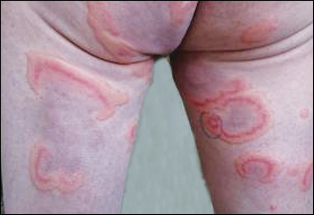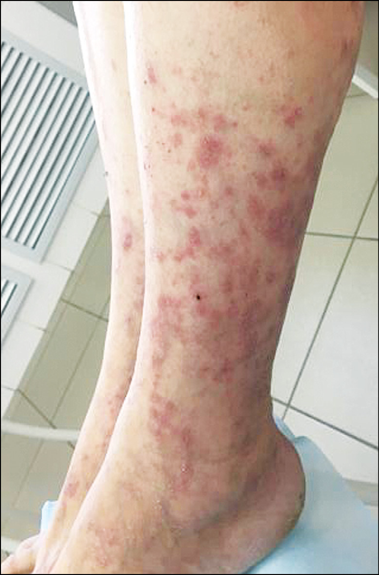 Рис. 1. Уртикарный тип; в отличие от крапивницы волдыри при уртикарном ангиите отличаются стойкостью, сохраняясь на протяжении 1–3 суток или более. Вместо выраженного зуда больные обычно испытывают жжение или чувство раздражения кожи.