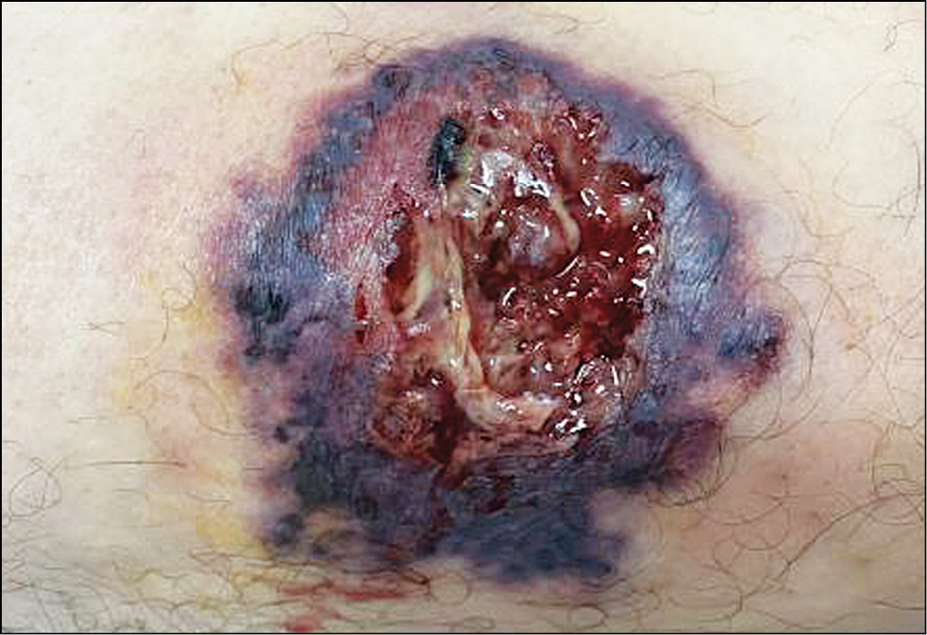 Рис. 2. Пустулёзно-язвенный тип (гангренозная пиодермия). Начинается остро с фурункулоподобного элемента, который трансформируется в язвенный очаг с быстрым эксцентричным ростом за счёт распада отёчного, синюшно-красного, периферического валика. Относится к группе нейтрофильных дерматозов.