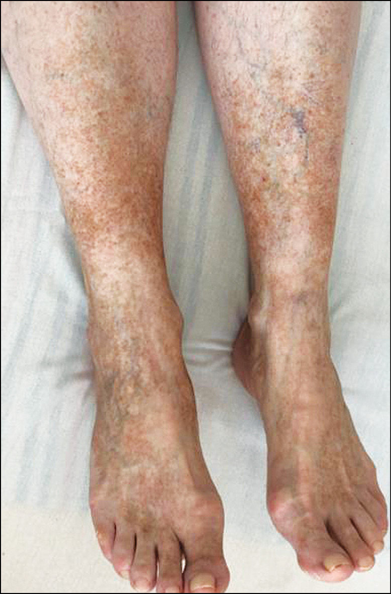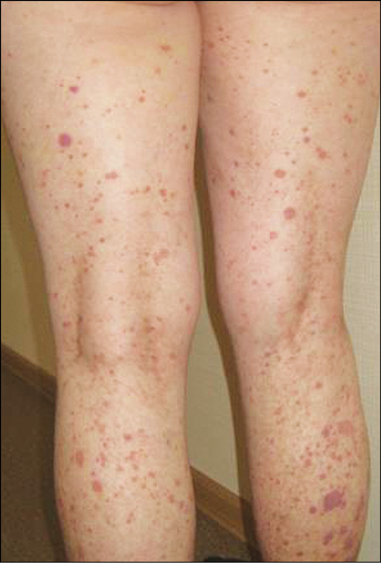 Рис. 8. Петехиальный тип. Хронический дермальный капиллярит с исходом в стойкие буровато-жёлтые пятна гемосидероза.
