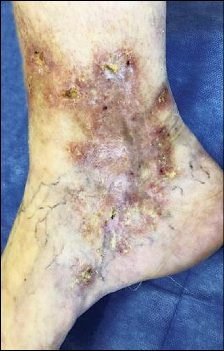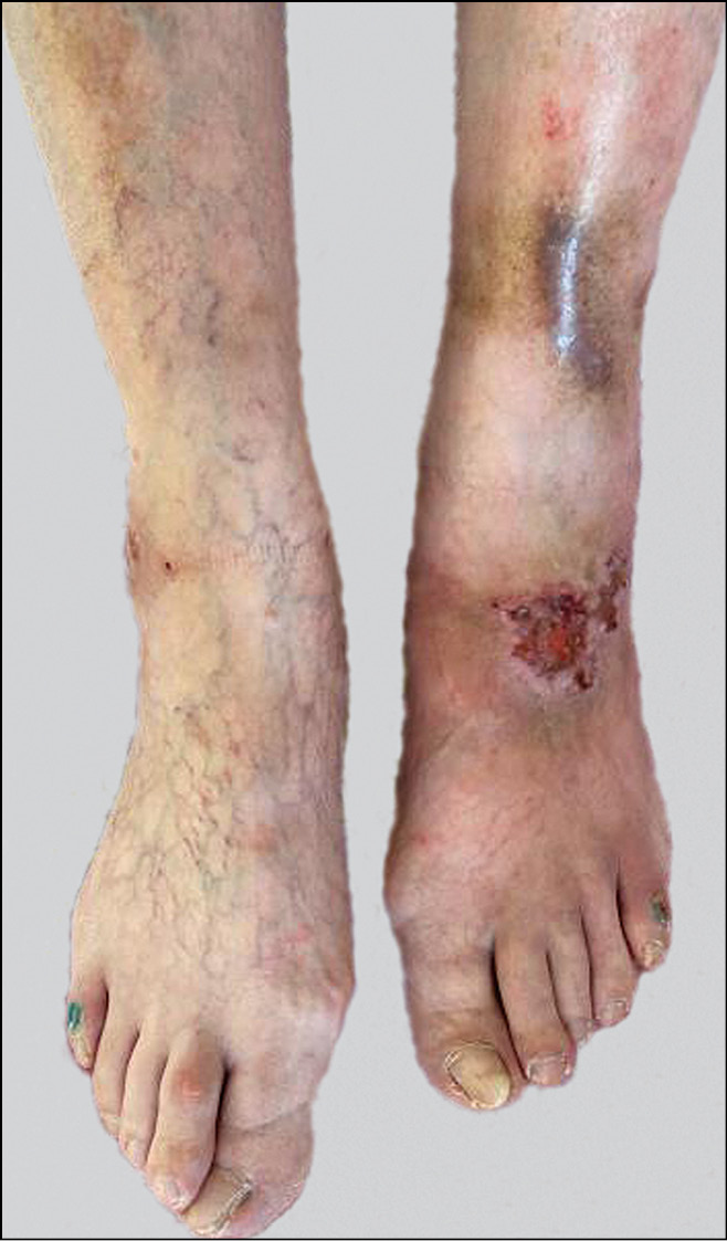 Рис. 11. Ливедо-ангиит с изъязвлением. Часто выявляют гиперкоагуляцию, связанную с мутациями факторов свертывания крови (факторы коагуляции FII, FV, FXIII).