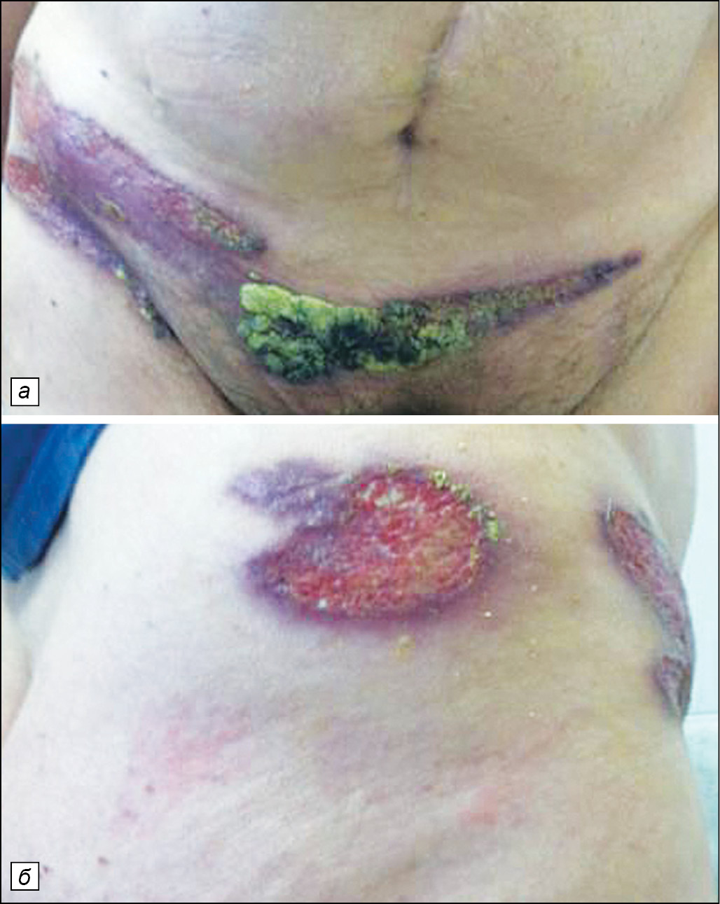 Рис. 6. Гангренозная пиодермия (нетипичная локализация). Высыпания могут быть на любом участке кожного покрова (а, б), но чаще на нижних конечностях.
