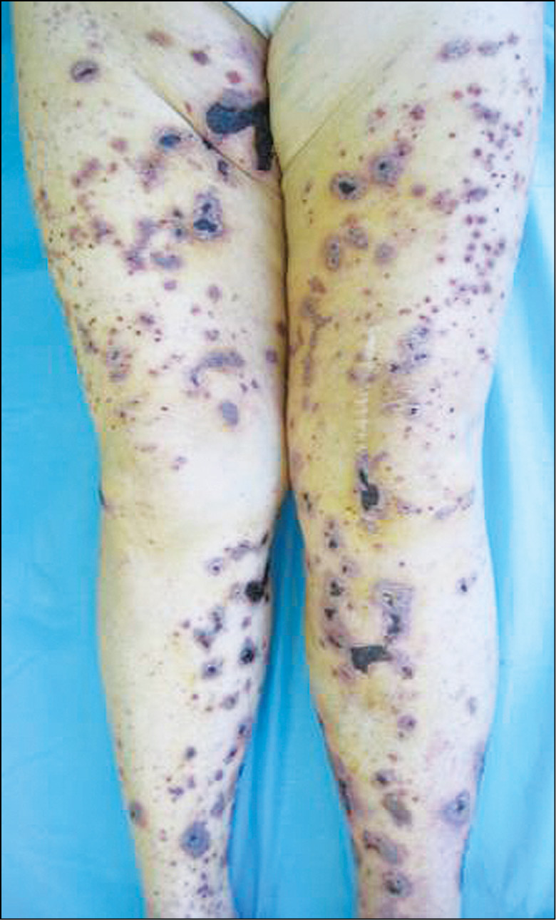 Рис. 5. Некротически-язвенный тип. Чаще всего начинается с геморрагических высыпаний, которые сопровождаются некрозами с формированием язвенных дефектов. Процесс симметричный.