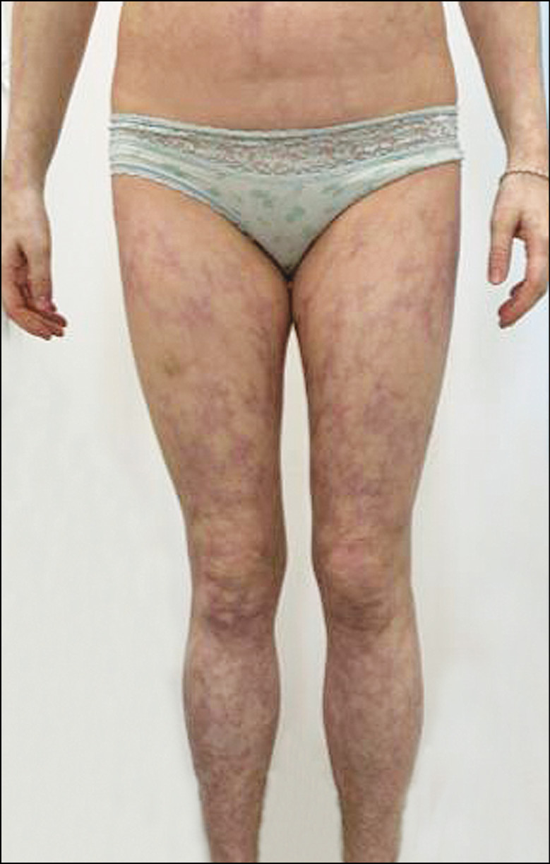 Рис. 10. Ливедо-ангиит. Утром окраска пятен едва заметна, а к вечеру резко усиливается. В патогенезе часто играют роль антифосфолипидные антитела, являясь факторами активации гемокоагуляции и образования тромбов.