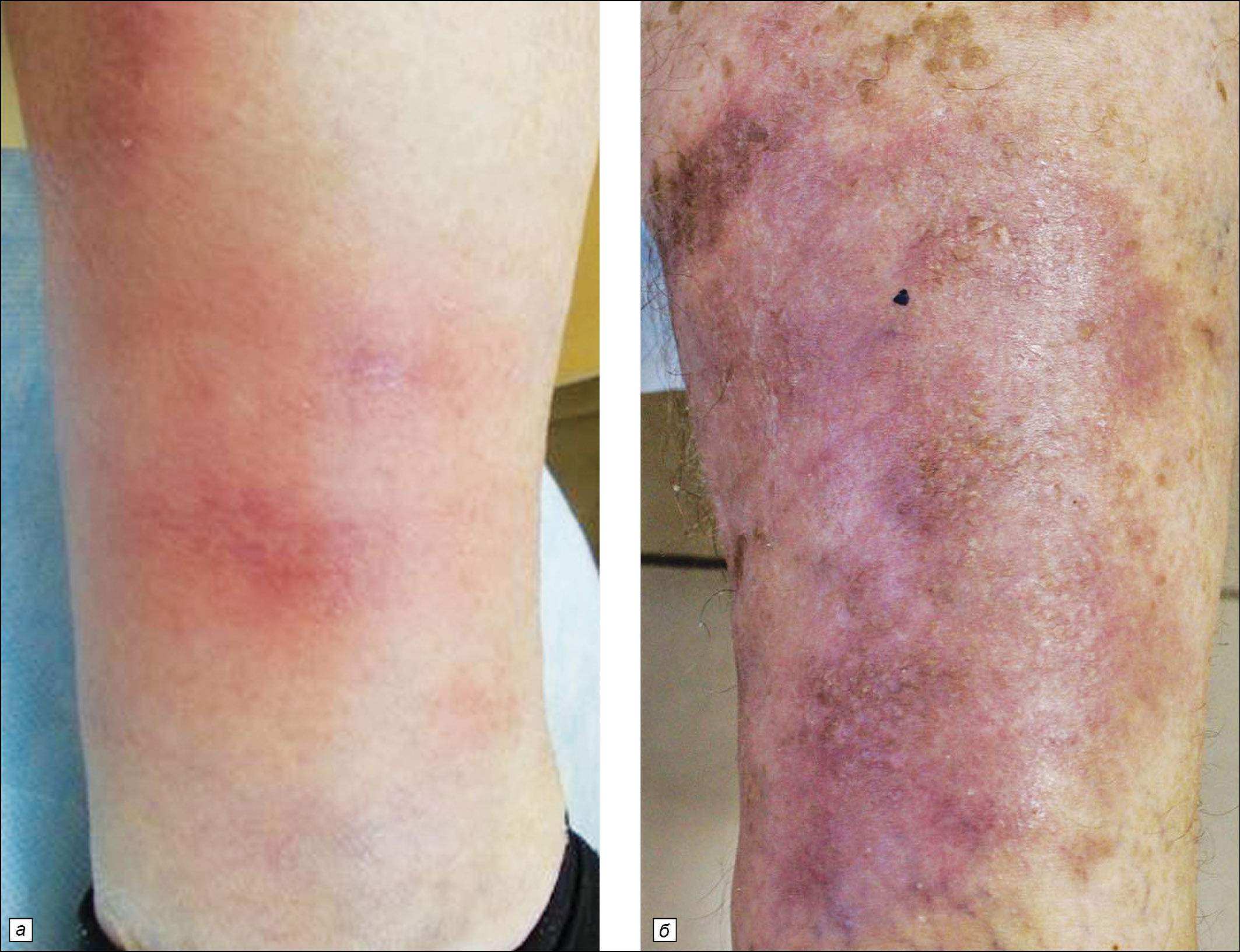 а – острый; высыпания появляются остро на голенях и сопровождаются выраженной болезненностью и фибриллитетом; б – хронический; отличается упорным рецидивирующим течением обычно у женщин зрелого возраста на фоне объёмных и хронических воспалительных заболеваний органов малого таза.