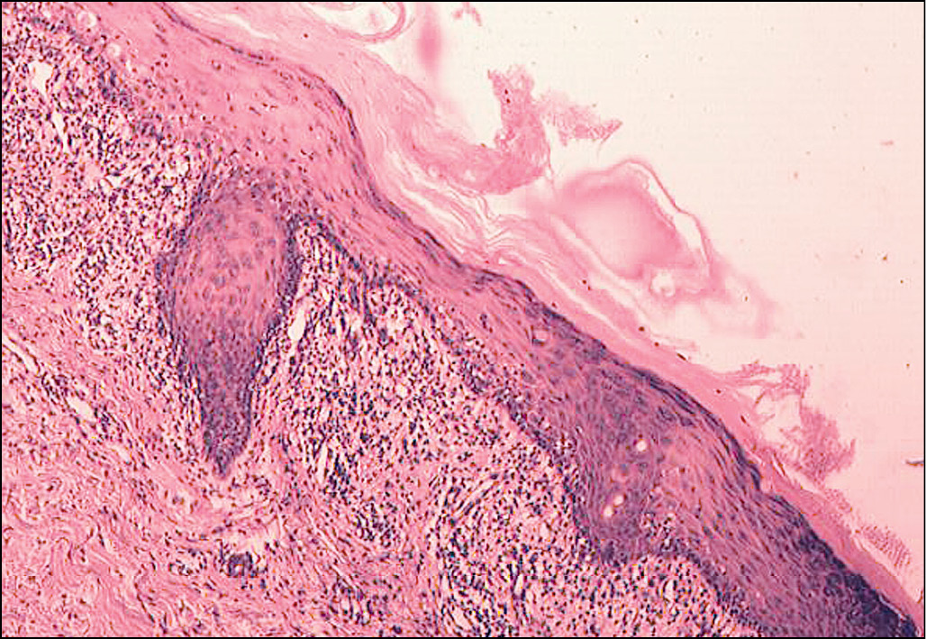 Гистологическое исследование. Гиперкератоз с роговой пробкой в углублении эпидермиса, вакуольная дегенерация базального слоя, отёк дермы, расширение кровеносных и лимфатических сосудов, образование лимфоцитарных инфильтратов вокруг сосудов и придатков кожи, явления васкулита.