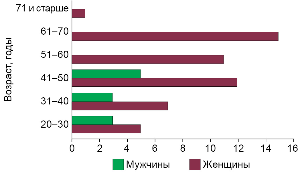 При проведении клинико-морфологического фенотипирования 104 пациентов (86 женщин и 18 мужчин) в возрасте от 20 до 71 (средний возраст 56 ± 5) года (рис. 1), находящихся на стационарном и амбулаторном лечении в клинике кожных и венерических болезней им. И.М. Рахманова с диагнозом ограниченной склеродермии, были отобраны пациенты со склероатрофическими поражениями аногенитальной зоны.