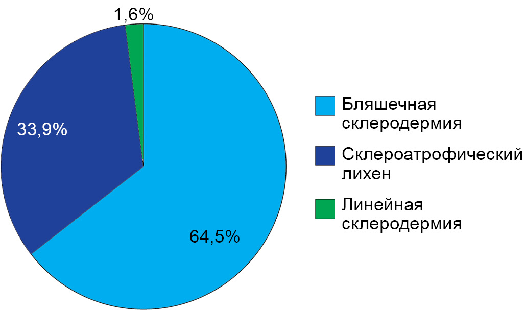 В период с 2017 по 2019 г. в клинике кожных и венерических болезней им. В.А. Рахманова под наблюдением находились 104 пациента с различными клиническими формами ограниченной склеродермии (бляшечная склеродермия, линейная склеродермия, склероатрофический лихен, атрофодермия Пазини–Пьерини).