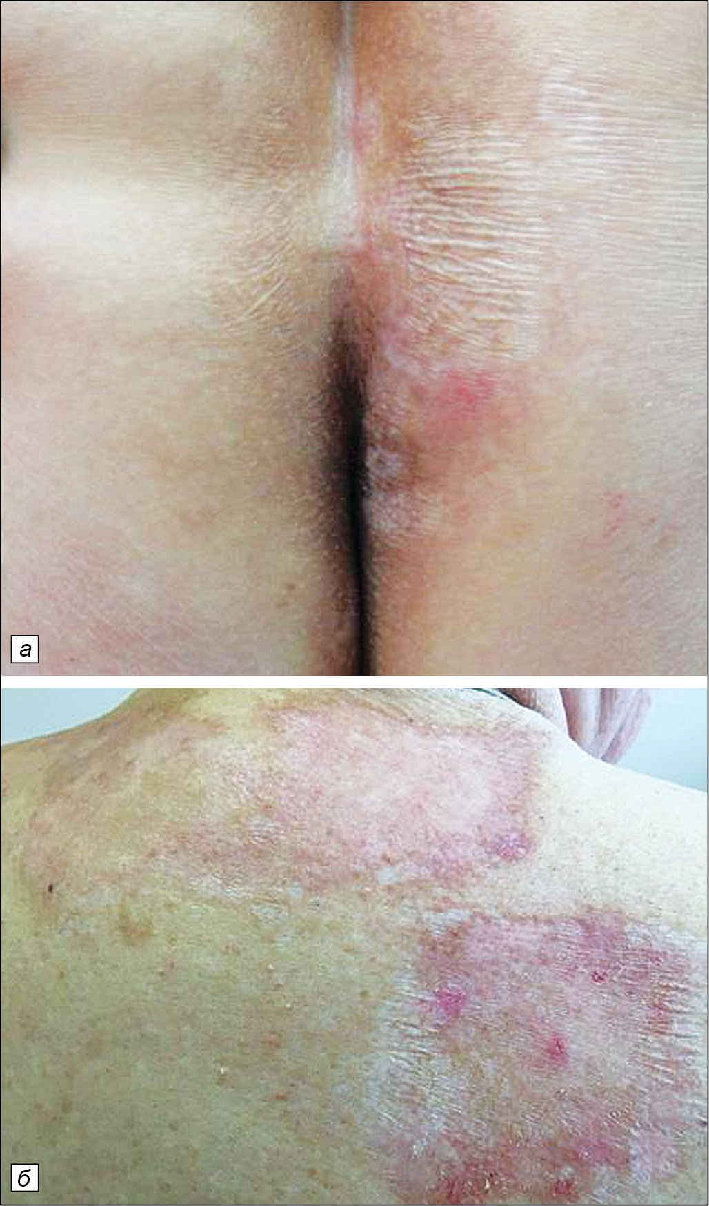 Рис. 3. Больной Н., 55 лет. Бляшечная склеродермия. а – поражение кожи перианальной области; б – поражение кожи спины.