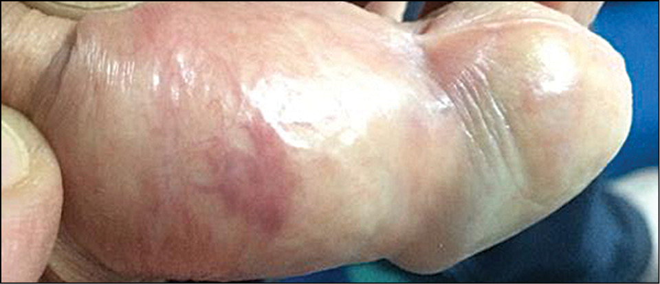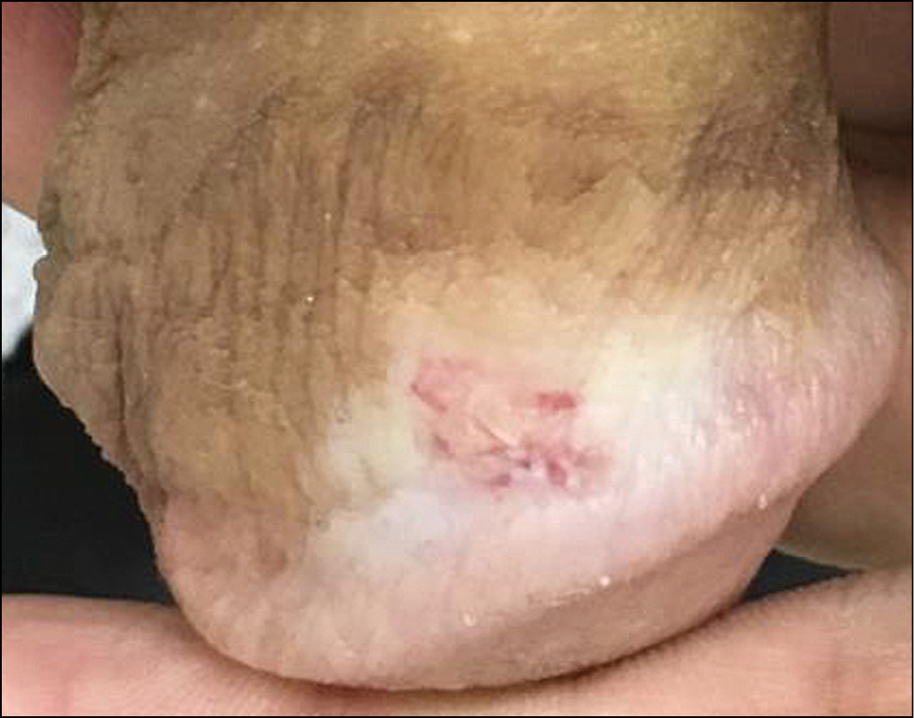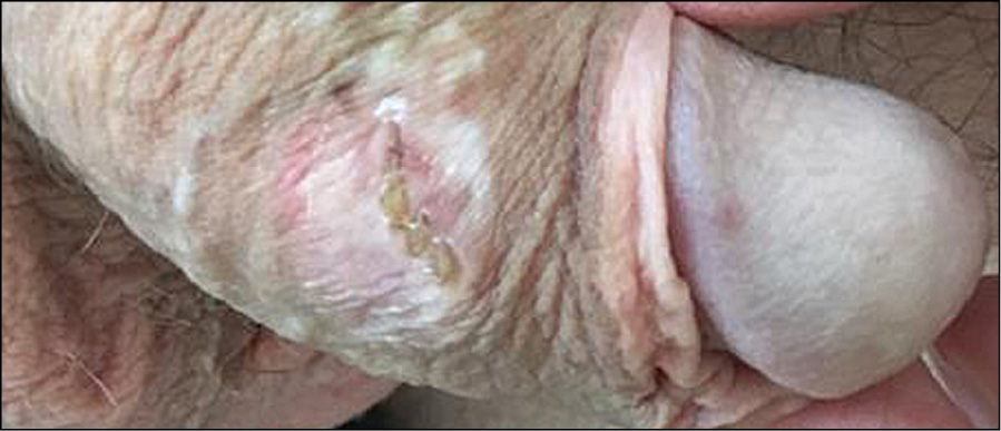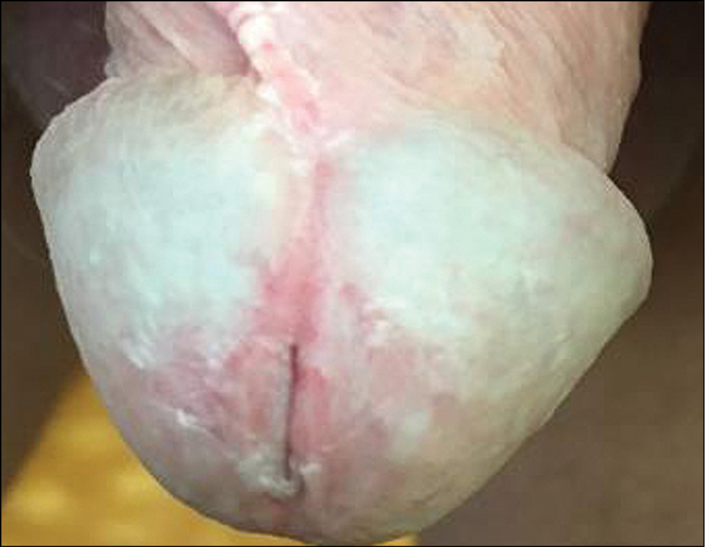 Рис. 11. Склероатрофический лихен с частичным поражением тканей крайней плоти и головки полового члена.