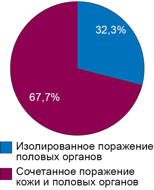 Клиническая разновидность | Изолированное поражение половых органов | Сочетанное поражение половых органов и экстрагенитальная локализация очагов | Всего | |||