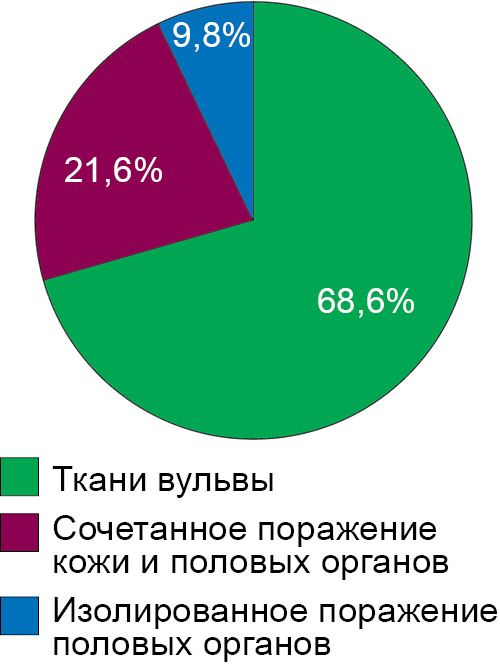 Рис. 16. Особенности локализации поражений половых органов при ограниченной склеродермии у женщин (n = 51).