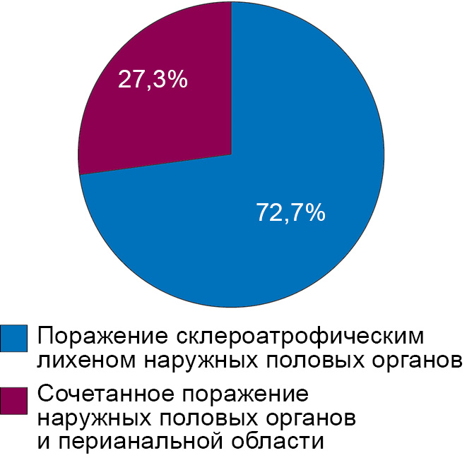 При анализе клинических особенностей характера и степени распространённости склероатрофических поражений тканей аногенитальной зоны у мужчин установлено, что в 72,7% случаев патологическим процессом были затронуты наружные половые органы (ствол полового члена, мошонка), а сочетанное поражение половых органов и перианальной области наблюдалось у 27,3% пациентов. Склероатрофическое поражение головки полового члена выявлено у 81,8%, поражение тканей уздечки – у 54,5%, кожи ствола полового члена – у 27,3%, перианальной области – у 27,3% пациентов (табл. 3; см. рис. 3, а, 11–14, 17).