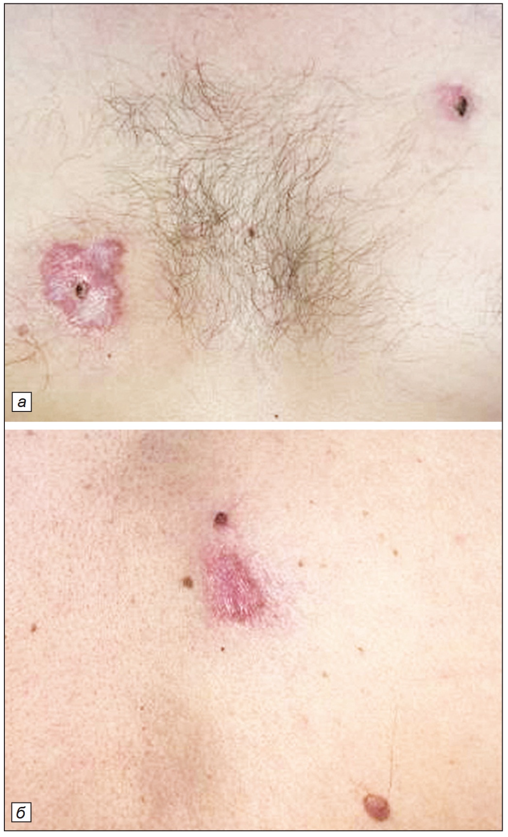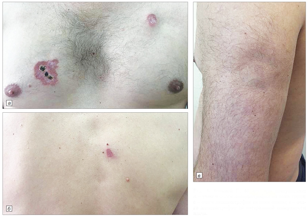 На фоне проведённого лечения наблюдалась положительная динамика со стороны кожного процесса: отсутствие свежих узловатых элементов, регресс наслоений чешуекорок, уменьшение инфильтрата (рис. 3, а, б)