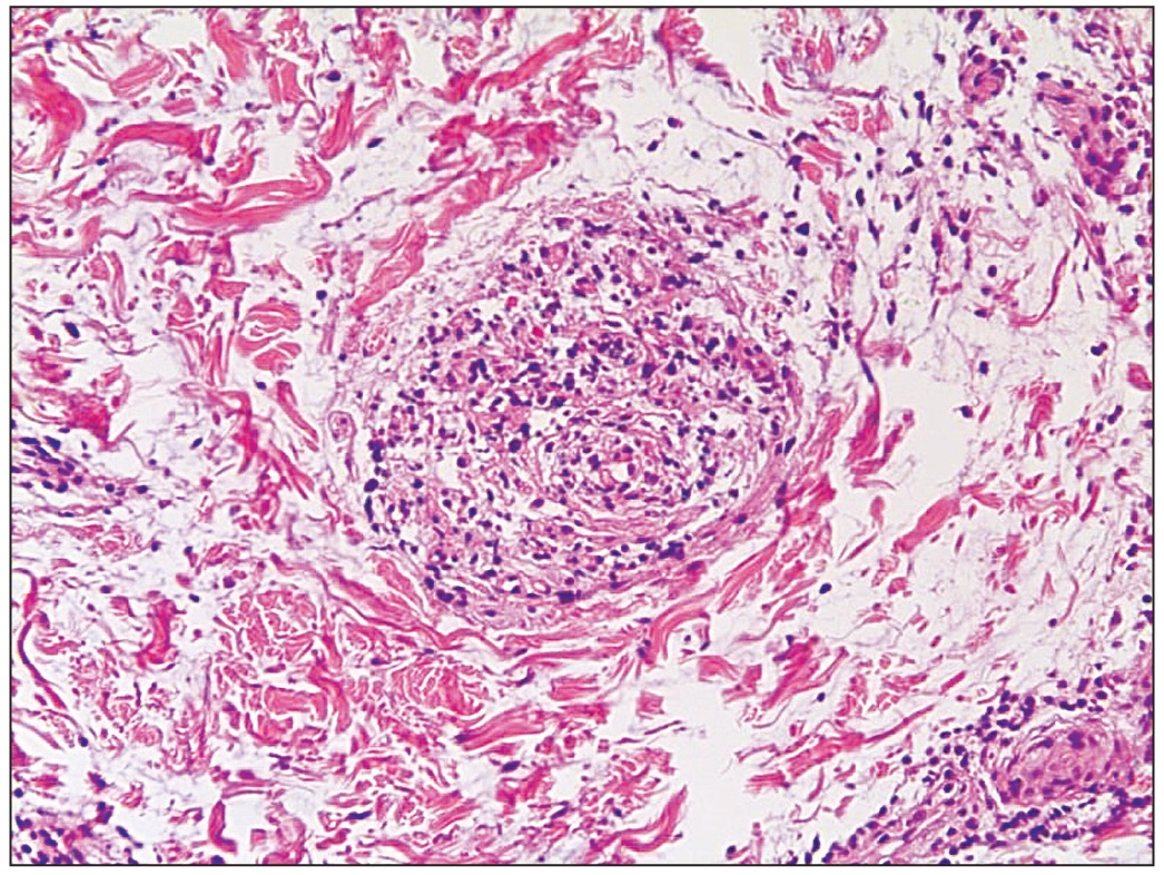 Индуративная эритема Базена развивается у пациентов с туберкулёзом в анамнезе; локализуется, как правило, в икроножной области; гистологически выявляется гранулематозный инфильтрат с очагами некроза [21].