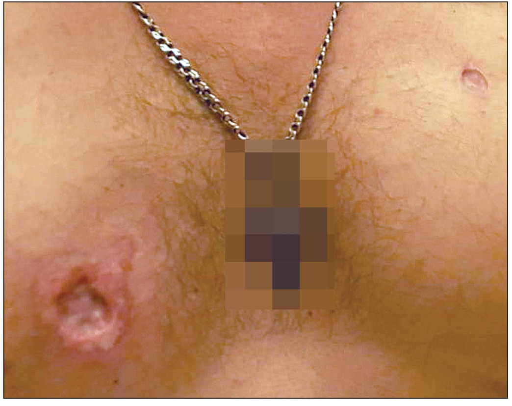 Из анамнеза заболевания известно, что в феврале 2016 г. пациент впервые отметил появление узлов на латеральной поверхности плеч, верхней трети спины и в области грудины. В связи с этим он обратился в кожно-венерологический диспансер по месту жительства, где было рекомендовано проведение диагностической биопсии кожи для уточнения диагноза. По результатам биопсии был установлен диагноз дискоидной красной волчанки. Пациент неоднократно проходил лечение в кожно-венерологическом диспансере по месту жительства. Общая терапия: Плаквенил 200 мг 1 таблетка 1 раз в сутки; местно: ихтиоловая мазь; физиотерапия: электрофорез с лидазой, фонофорез с мазью Дермовейт с временным положительным эффектом в виде разрешения высыпаний с исходом в липоатрофию. Однако позднее кожный процесс прогрессировал, появлялись новые узлы. Консультирован ревматологом, который исключил системную красную волчанку.