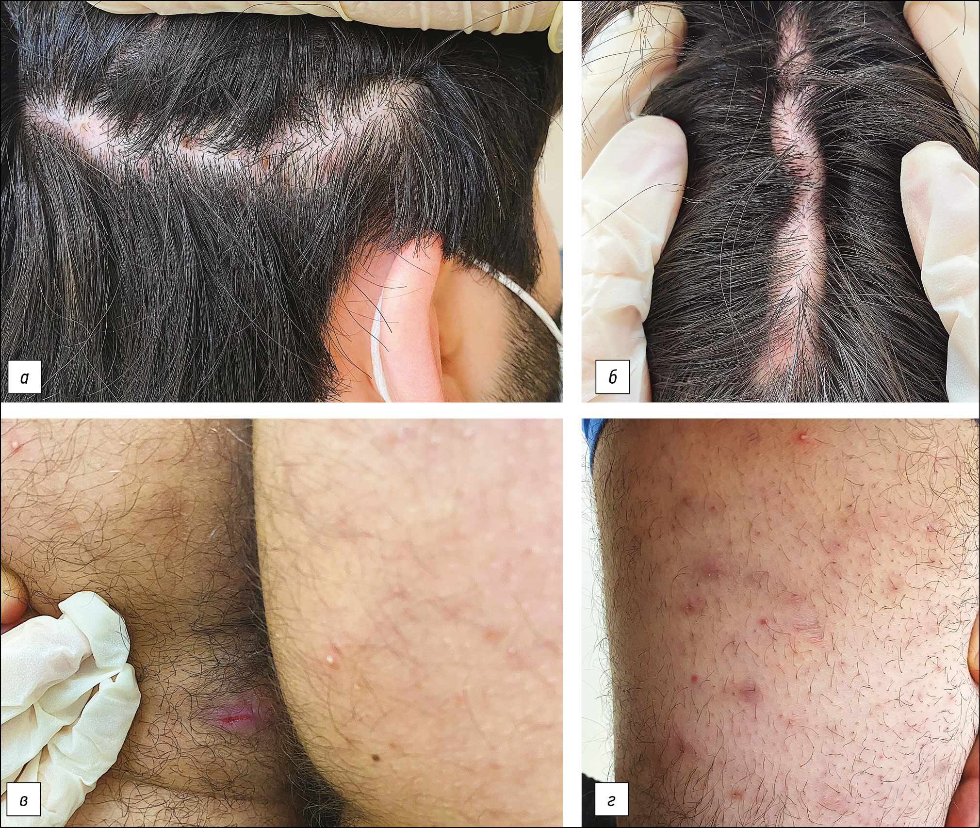 Рис. 1. Больной Г., 20 лет, с инверсным акне. Высыпания расположены в области волосистой части головы, паховой области, внутренней части бёдер, перианальной области: а ― фолликулярные папулы, пустулы, эрозии и очаги рубцовой атрофии; б ― фиброзный тяж каменистый плотности без отделяемого, в области расположения которого рост волос разрежен; в ― в перианальной области визуализируется вскрывшийся дренирующий абсцесс и формирование синусного хода; г ― фолликулярные папулы и единичные пустулы, очаги рубцовой атрофии и поствоспалительная гиперпигментация. / Fig. 1. Patient G., 20 years old, with inverse acne. Rashes are located in the scalp, groin, inner thighs, perianal region: а ― follicular papules, pustules, erosion and foci of cicatricial atrophy; б ― fibrous cord of stony density without discharge, in the area of which hair growth is sparse; в ― in the perianal region, an opened draining abscess and the formation of a sinus course are visualized; г ― follicular papules and single pustules, foci of cicatricial atrophy and post-inflammatory hyperpigmentation.