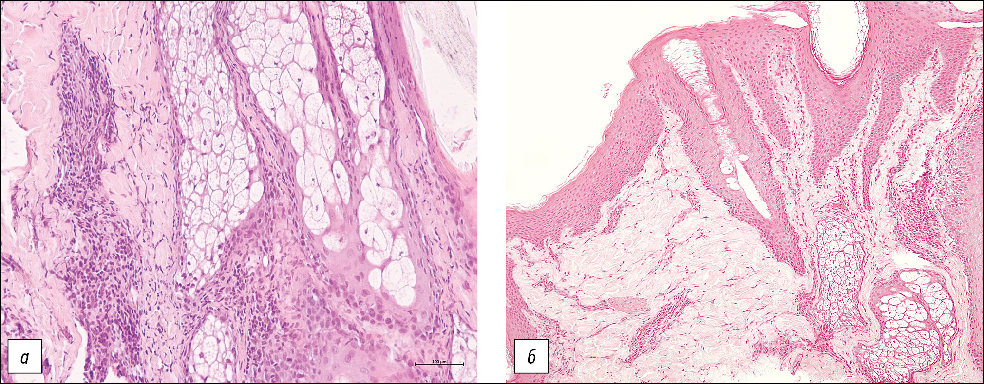 Рис. 2. Тот же больной. Гистологическая картина биоптата кожи волосистой части головы: а ― гиперплазия сальных желёз; вокруг отдельных сально-волосяных юнитов выраженная лимфоидная инфильтрация; б ― инфундибулярный гиперкератоз, гиперплазия фолликулярного эпителия / Fig. 2. The same patient. The histological picture of the scalp biopsy specimen: а ― hyperplasia of the sebaceous glands; pronounced lymphoid infiltration around individual sebaceous hair units; б ― infundibular hyperkeratosis, hyperplasia of follicular epithelium.