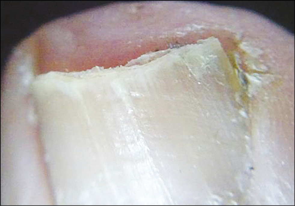 2) нормотрофический (дистальный, латеральный, тотальный): данный тип представляет собой результат прогрессирования микотического процесса ногтевой пластинки, когда возбудитель проникает далеко в проксимальном направлении, но утолщение ногтевой пластинки или выраженный подногтевой гиперкератоз отсутствует (рис. 2);