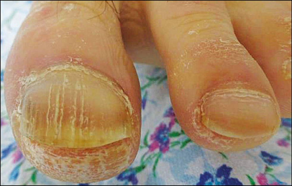 Рис. 2. Нормотрофический тип поражения ногтевых пластинок стоп при онихомикозе, вызванном Trichophyton rubrum. КИОТОС = 12. Собственное наблюдение.