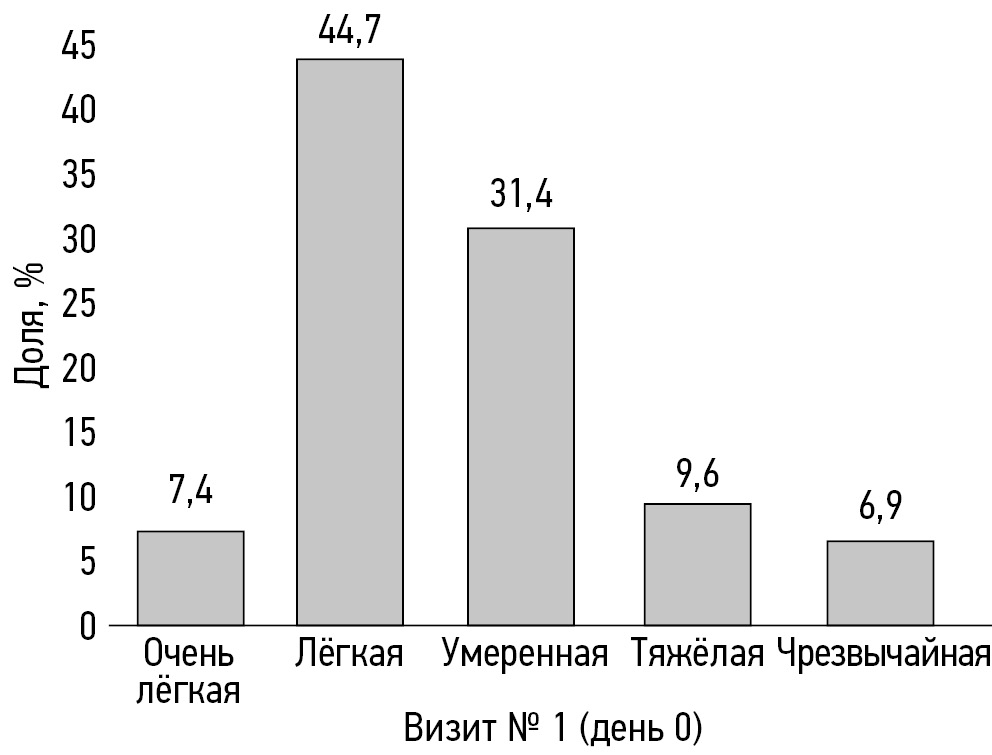 На визите № 1 (день 0) у 118/1602 (7,4%) пациентов зарегистрирована очень лёгкая выраженность микологических симптомов по шкале КИОТОС, у 717/1602 (44,7%) ― лёгкая выраженность симптомов, у 503/1602 (31,4%) ― умеренная симптоматика, у 154/1602 (9,6%) ― тяжёлая симптоматика, у 110/1602 (6,9%) ― чрезвычайная выраженность микологических симптомов.