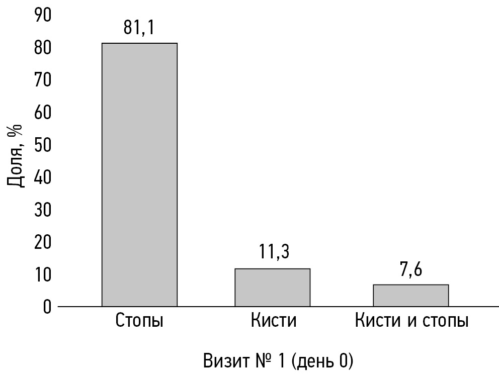 По локализации онихомикоза «стопы/кисти» (рис. 8) преобладали стопы ― 81,1% (n=1299); пациенты с одновременным поражением стоп и кистей составили 7,6% (n=122), с изолированным поражением кистей ― 11,3% (n=181).