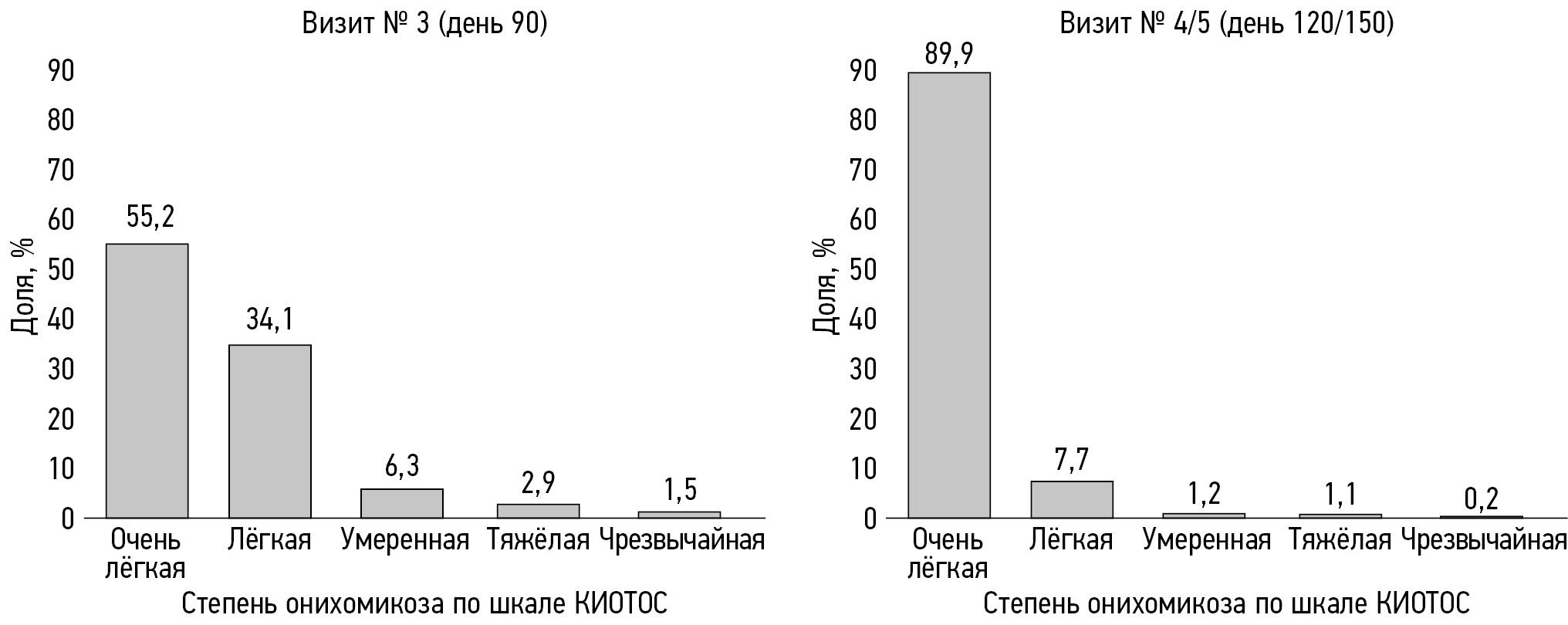 На визите № 4 (день 120/150) у 1439/1602 (89,8%) пациентов зарегистрирована очень лёгкая выраженность микологических симптомов по шкале КИОТОС, у 123/1602 (7,7%) ― лёгкая выраженность симптомов, у 20/1602 (1,2%) ― умеренная симптоматика, у 17/1602 (1,1%) ― тяжёлая симптоматика и только у 3/1602 (1,5%) ― чрезвычайная выраженность (рис. 9).