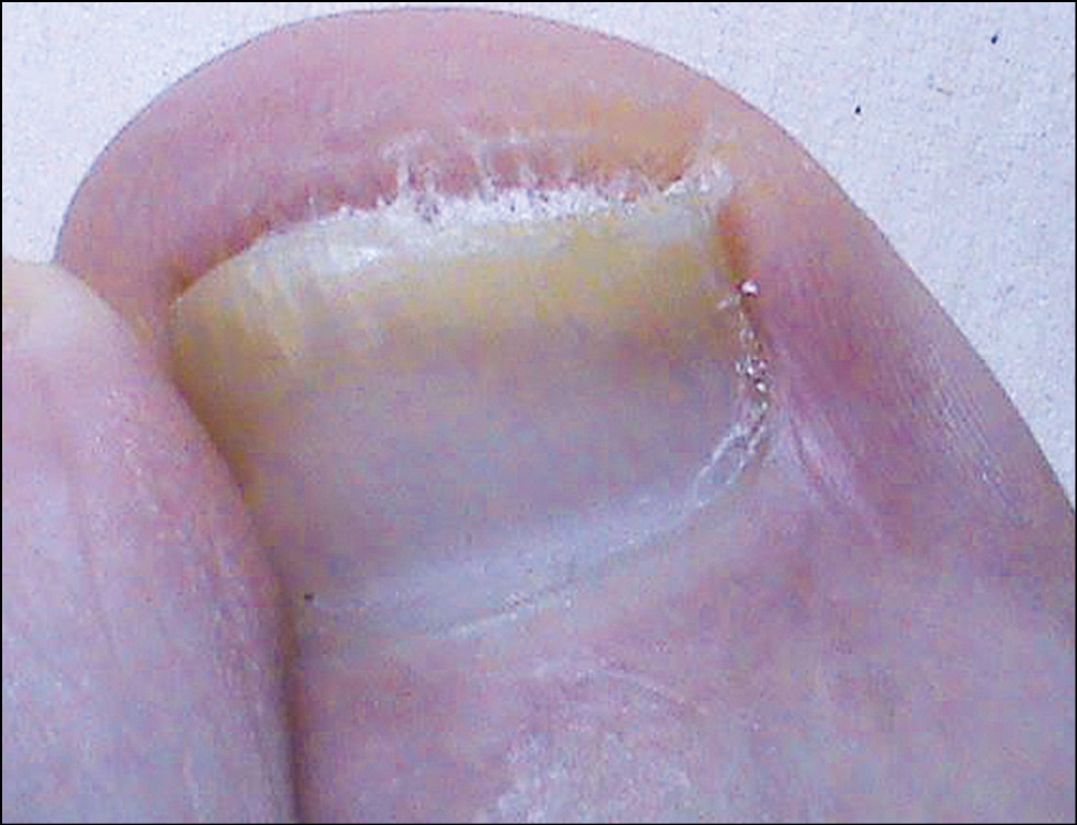 Рис. 10. Сформировавшаяся (по мере отрастания ногтя) демаркационная зона в результате комбинированной терапии препаратом Экзифин®. Собственное наблюдение.