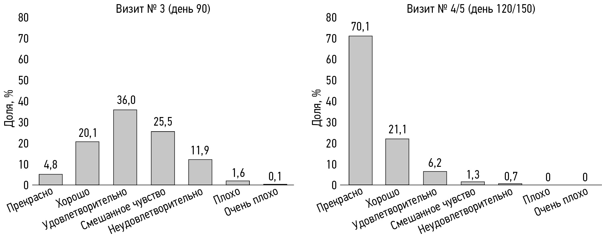 На визите 4/5 (день 120/150) оценку «прекрасно» дали 1123/1602 (70,1%) пациента, «хорошо» ― 347/1602 (21,7%), «удовлетворительно» ― 100/1602 (6,2%), «смешанное чувство» ― 21/1602 (1,3%), «неудовлетворительно» ― лишь 11/1602 (0,7%); оценки «плохо» и «очень плохо» не поставил ни один пациент.