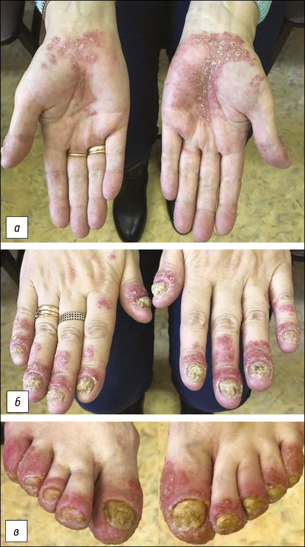 Pic. 1. Patient I., 44 years old. Pustular psoriasis and arthropathy before treatment.