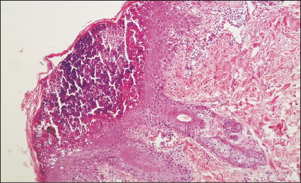 The preparation subcorneally determines the spongioform pustule of Kagoi. Against the background of acanthosis, there are separate granulocytic neutrophil infiltrates. Stained with hematoxylin-eosin ×100.