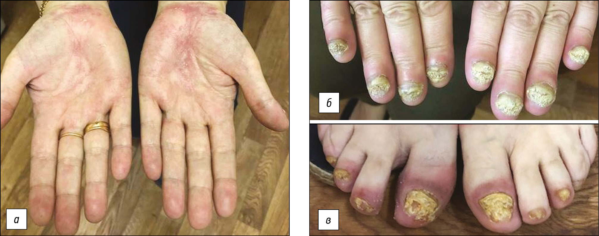 b-psoriatic rashes on the distal parts of the fingers of the hands; pronounced hyperkeratosis in combination with onycholysis of the nail plates. Signs of acute dactylitis of the I, II, V fingers and" radish-like " defiguration of the I – IV fingers.