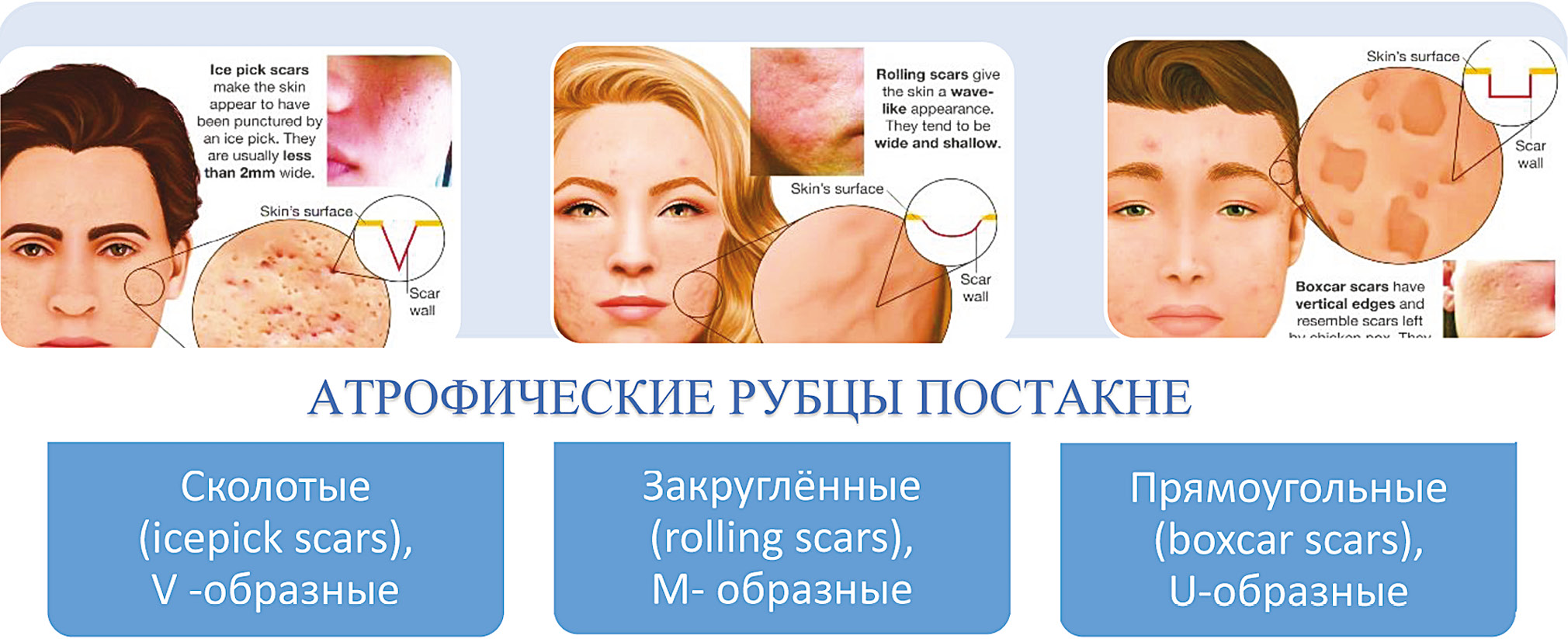 Атрофические рубцы постакне бывают узкими и широкими, глубокими и поверхностными, сколотыми, ямкообразными, волнистыми, кратеро- и блюдцеобразными [8]. Плеоморфизм рубцов постакне затрудняет интерпретацию результатов клинического осмотра. В настоящее время используют различные классификации атрофических рубцов, но хотелось особо выделить классификацию атрофических рубцов C.I. Jacob, согласно которой выделяют три их подтипа: V-образные (Ice-pick), М-образные (Rolling), U-образные (Boxcar) [8, 9]. Данное деление интересно тем, что автором учитывается сразу несколько параметров ― ширина, глубина и трёхмерная архитектура рубца. Так, C.I. Jacob и соавт. [9] трактуют V-образные (сколотые) рубцы как узкий и одновременно глубокий дефект кожи (диаметром менее 2–3 мм) с чёткими границами, достигающий уровня глубоких слоёв кожи. Наружное отверстие этого типа рубцов обычно немного шире, чем глубокая часть, которая пронизывает дерму и доходит до гиподермы, что и формирует V-образную форму [8–10]. Закруглённые (rolling scars), или М-образные, атрофические рубцы — длинные (более 4–5 мм), поверхностные, западают относительно уровня кожи, распространяются до границы дермы и гиподермы, придают поверхности волнистый вид. Прямоугольные (boxcar scars), или U-образные, ― это атрофические рубцы закруглённых форм с более выраженной широкой поверхностной частью, отвесными краями, которые не имеют тенденции к сужению в глубоких слоях, что и отличает их от V-образных подтипов; по глубине залегания могут быть как поверхностными, так и глубокими (рис. 1).