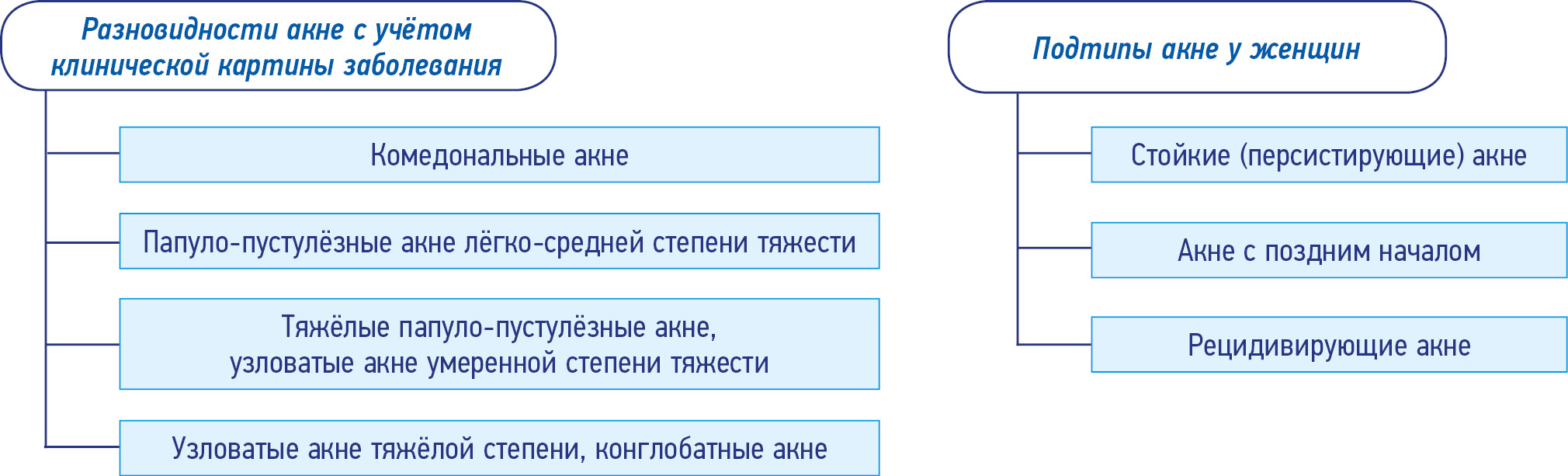 Для постановки диагноза и интерпретации клинической картины дерматоза использовали классификацию, предложенную в Европейских доказательных рекомендациях по лечению акне (European Evidence-based (S3) Guidelines for the Treatment of Acne, EADV; 2016) [2]. Ранжирование пациентов с поздними формами акне на подгруппы проводилось согласно классификации B. Dreno и соавт. (2013, EADV) [1]; рис. 2.