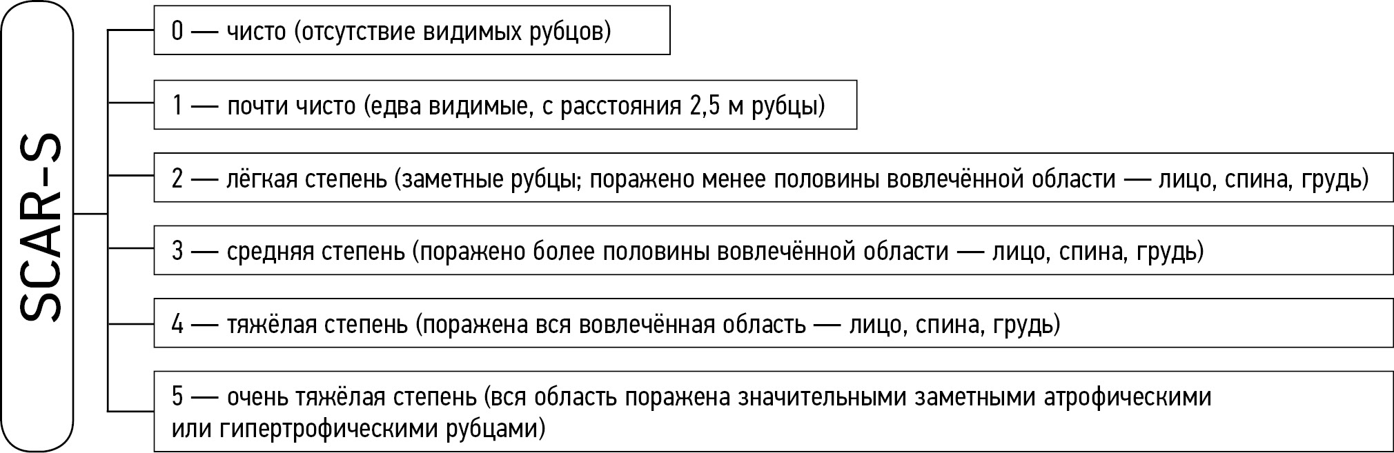 В 2010 г. J.K. Tan с соавт. [18] предложили систему оценки тяжести рубцов постакне (SCAR-S), в основу которой легла шестибалльная шкала, позволяющая оценивать рубцы постакне изолированно на различных участках кожи (лицо, грудь, спина); см. рис 3. Итоговая оценка складывается из суммы баллов по каждой области (от 0 до 15).