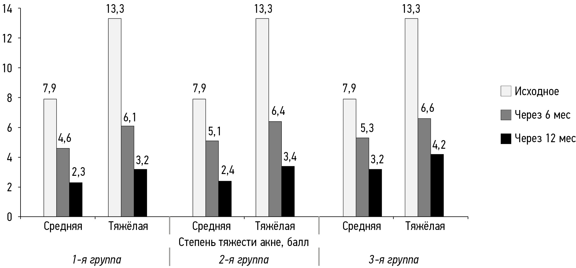 Степень тяжести акне оценивали при помощи дерматологического индекса (ДИА), отражающего количественную и качественную характеристику морфологических элементов сыпи. Для этого подсчитывали и регистрировали число комедонов, папул, пустул и узлов по следующим критериям: единичные — <5 элементов, умеренное количество — 6–15, большое количество — >15. Интерпретацию результатов ДИА проводили по следующим критериям: <5 баллов — лёгкая степень тяжести, 6–10 баллов — средняя степень тяжести, 10–15 баллов — тяжёлая степень акне. ДИА рассчитывали в 1; 6 и 12-й мес терапии: клиническое выздоровление соответствовало разрешению акне-элементов более 70%; значительное улучшение ― разрешению высыпаний на 70%; улучшение ― уменьшению индекса ДИА на 50% и более; без изменений ― отсутствие динамики [16, 17].
