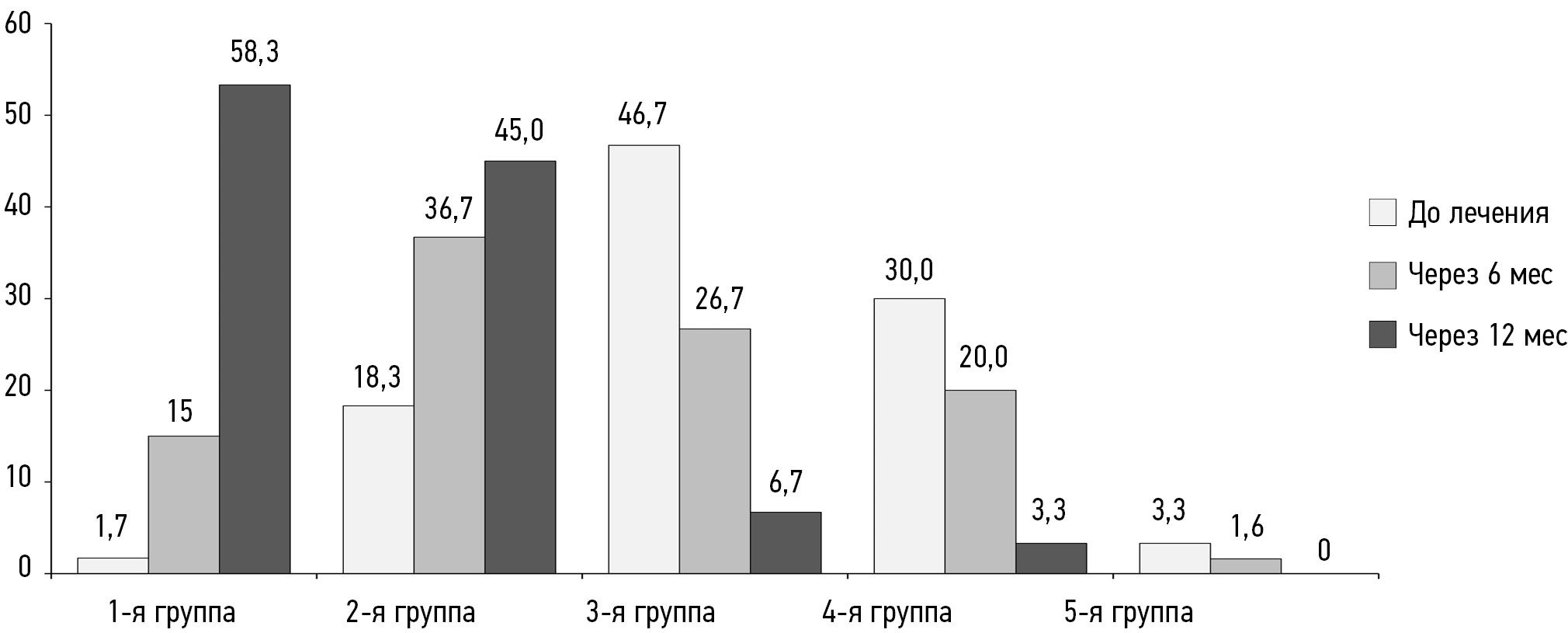 По времени формирования выделяли незрелые рубцы со сроком существования до года (у 20%) и зрелые ― соответственно, более 12 мес (у 80%). У пациентов с папуло-пустулёзной формой акне средней и тяжёлой степени преобладали U-образные рубцы ― у 53 (88,3%), V-образные ― у 49 (81,6%), М-образные ― у 43 (71,6%). По классификации D. Goodman и соавт., рубцы I уровня поражения наблюдались в 39 (65,0%) случаях, II ― в 57 (95,0%), III ― в 24 (40,0%), IV ― в 10 (16,6%), при этом суммарный индекс выраженности рубцов постакне составил 7 баллов. Распределение пациентов по шкале SCAR-S до начала лечения, через 6 и 12 мес представлено на диаграмме (рис. 5).