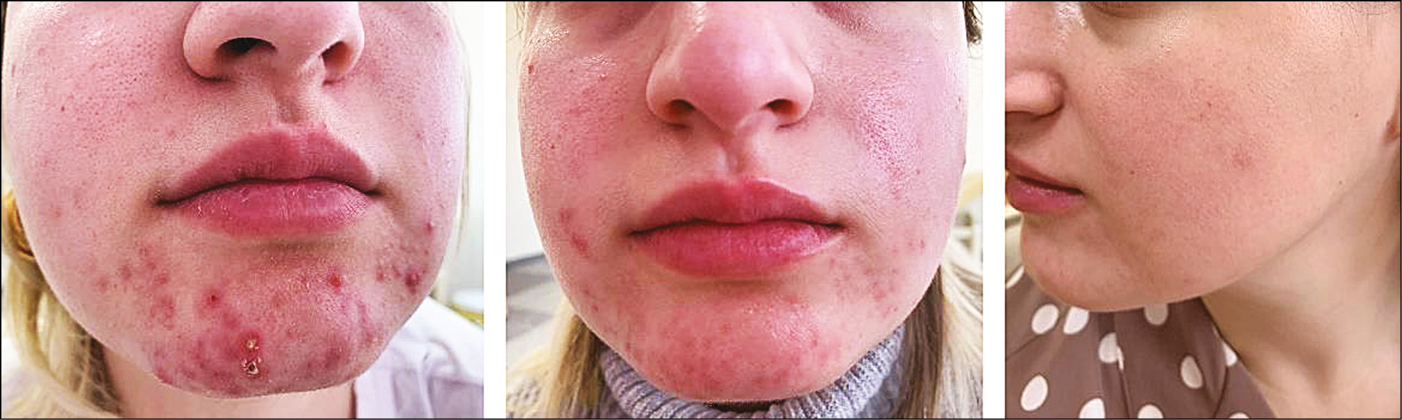 Рис. 7. Пациент С., клинические проявления акне в начале терапии, через 6 и 12 мес. / Fig. 7. Patient S., clinical manifestations of acne at the beginning of therapy, after 6 and 12 months.