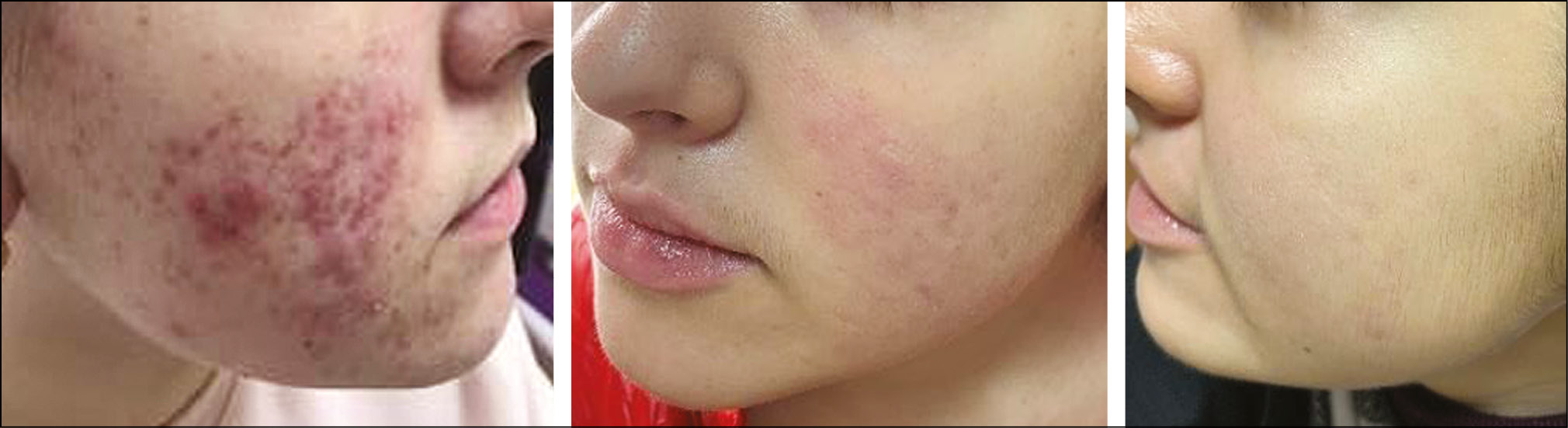 Осмотр пациентов проводили при первичном обращении, затем ежемесячно на протяжении всего курса лечения. Оценивалась динамика разрешения воспалительного процесса и существующих элементов постакне. На каждом визите у пациента оценивали нежелательные явления и побочные реакции.