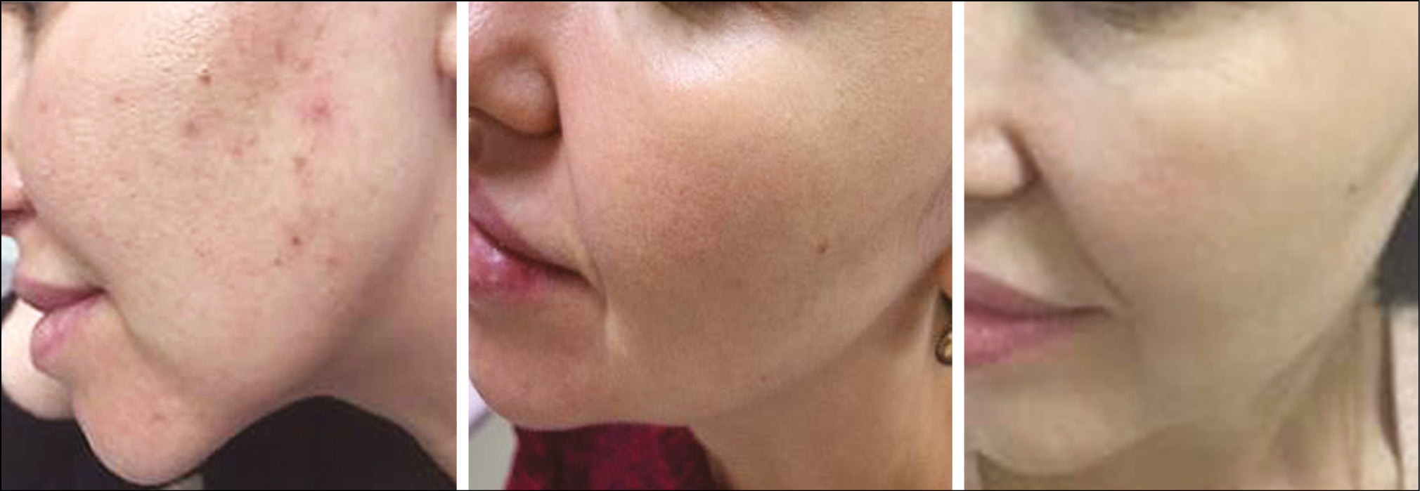Рис. 8. Пациент С., клинические проявления акне в начале терапии, через 6 и 12 мес. / Fig. 8. Patient S., clinical manifestations of acne at the beginning of therapy, after 6 and 12 months.