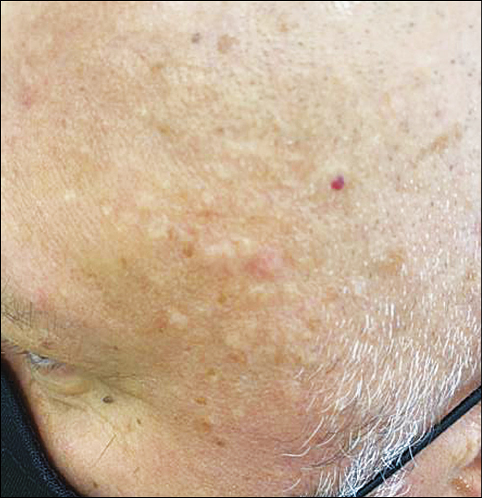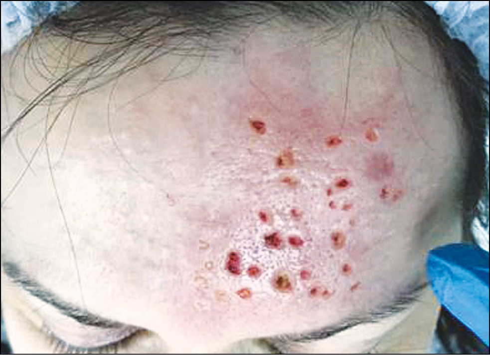 Локальный статус. На коже лба, нижней трети щёк отмечаются множественные высыпания в виде мелких папул размером от 0,3 до 0,5 мм, при пальпации плотные, безболезненные (рис. 6). Папулы белесоватого цвета, не сливаются между собой. Общее количество элементов достигает 24.