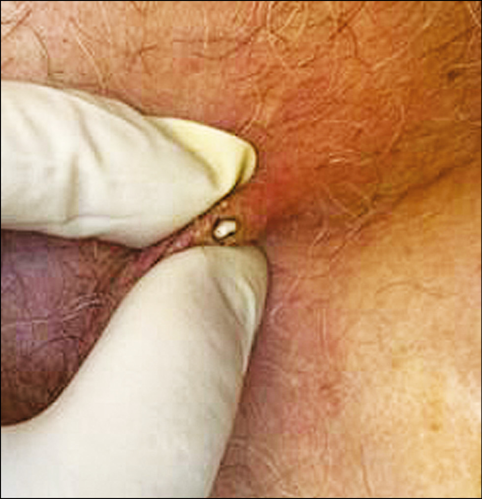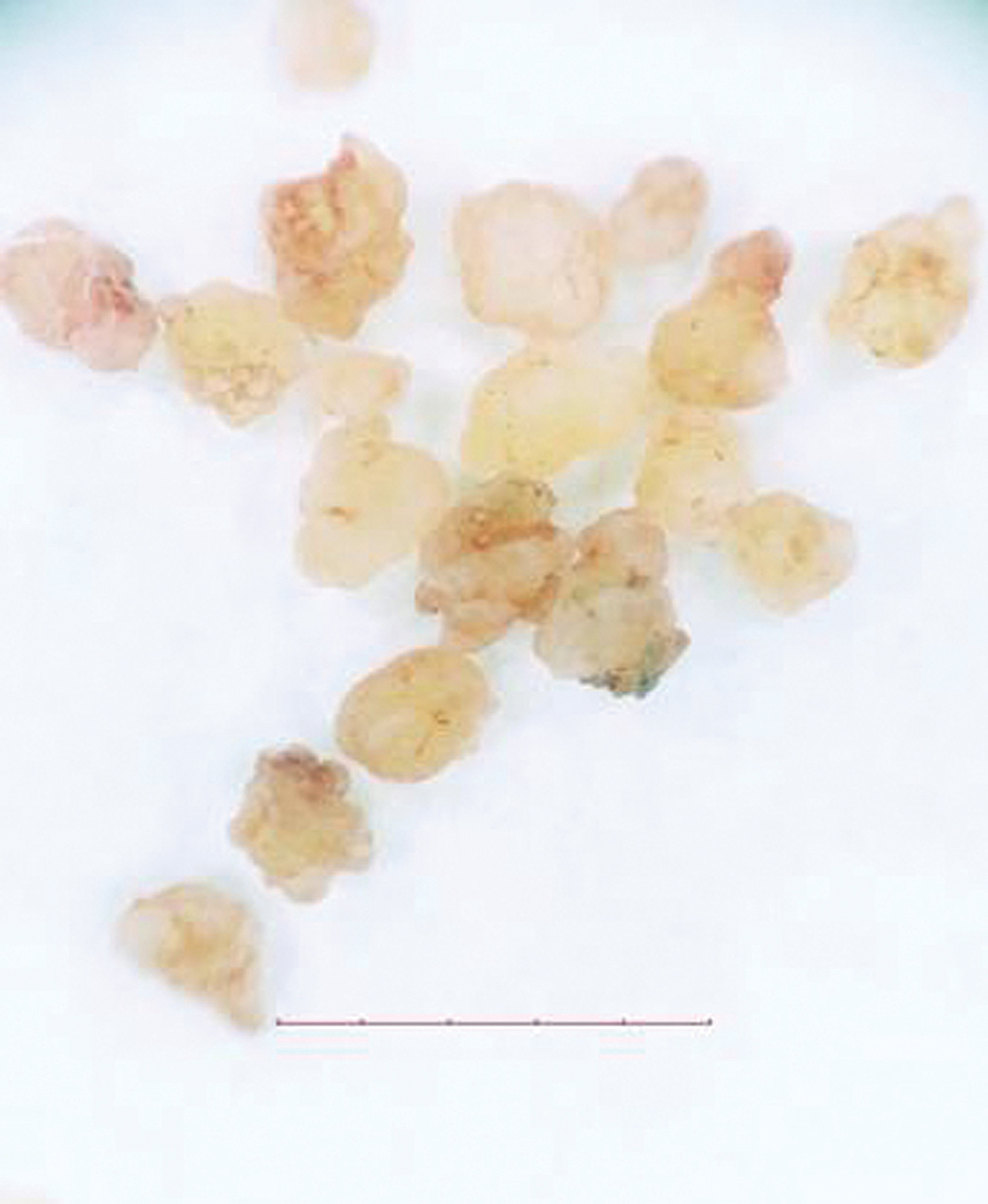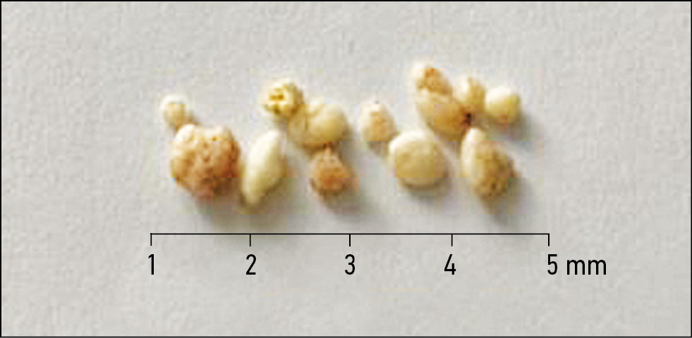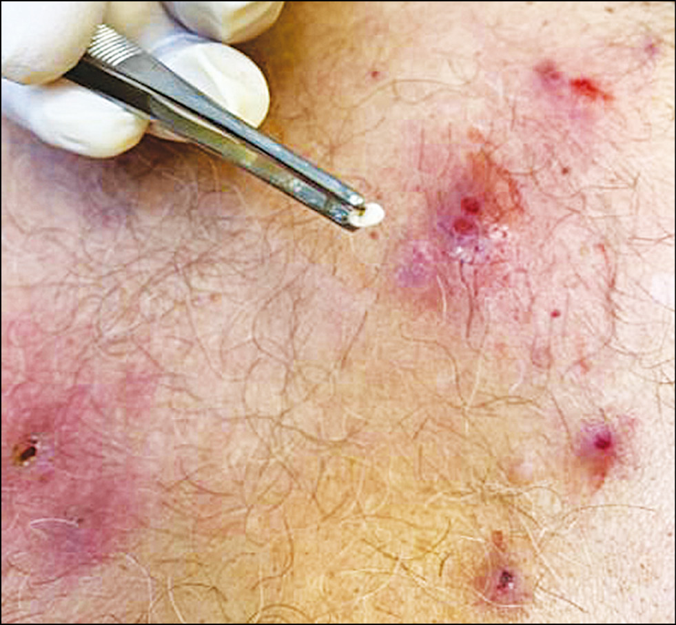 Лечение. Пациенту проведён кюретаж и удалены образования белесовато-желтоватого цвета, которые частично обнажались при вскрытии папул (рис. 4).