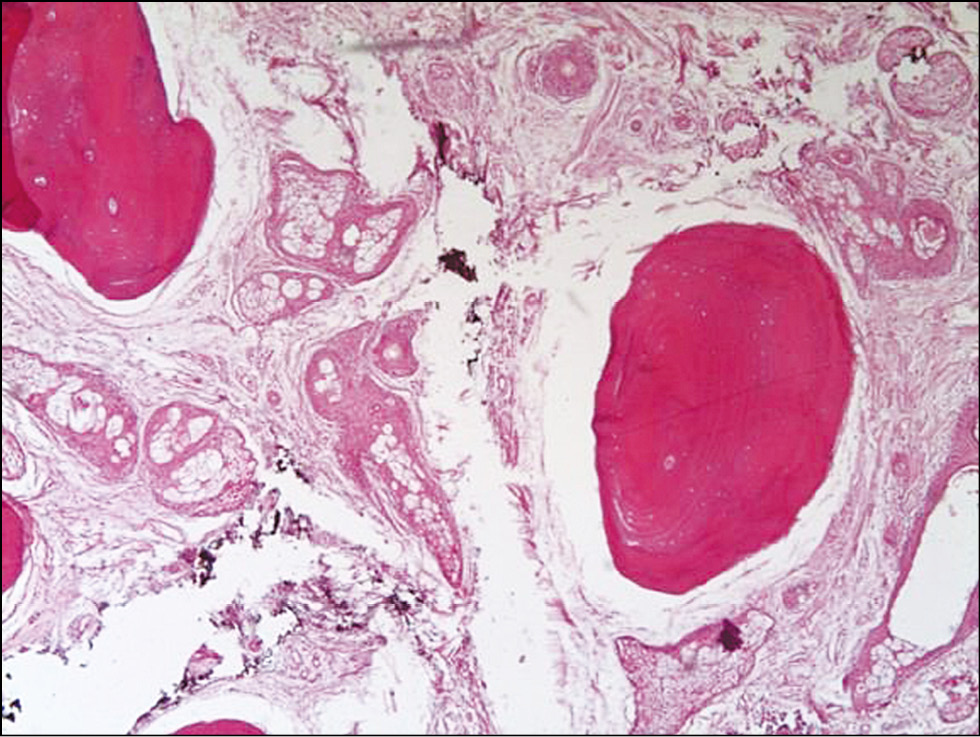 Патоморфологическое заключение (рис. 5): картина характеризуется наличием в дерме костных отростков с выраженным обызвествлением, а также плотных эозинофильных отложений в подкожной клетчатке; единичные отростки прободают эпидермис, единичные остеобласты и остеокласты. Мягкотканные пространства между костными трабекулами содержат несколько центрально расположенных мелких сосудов, соединительнотканный матрикс с единичными адипоцитами.