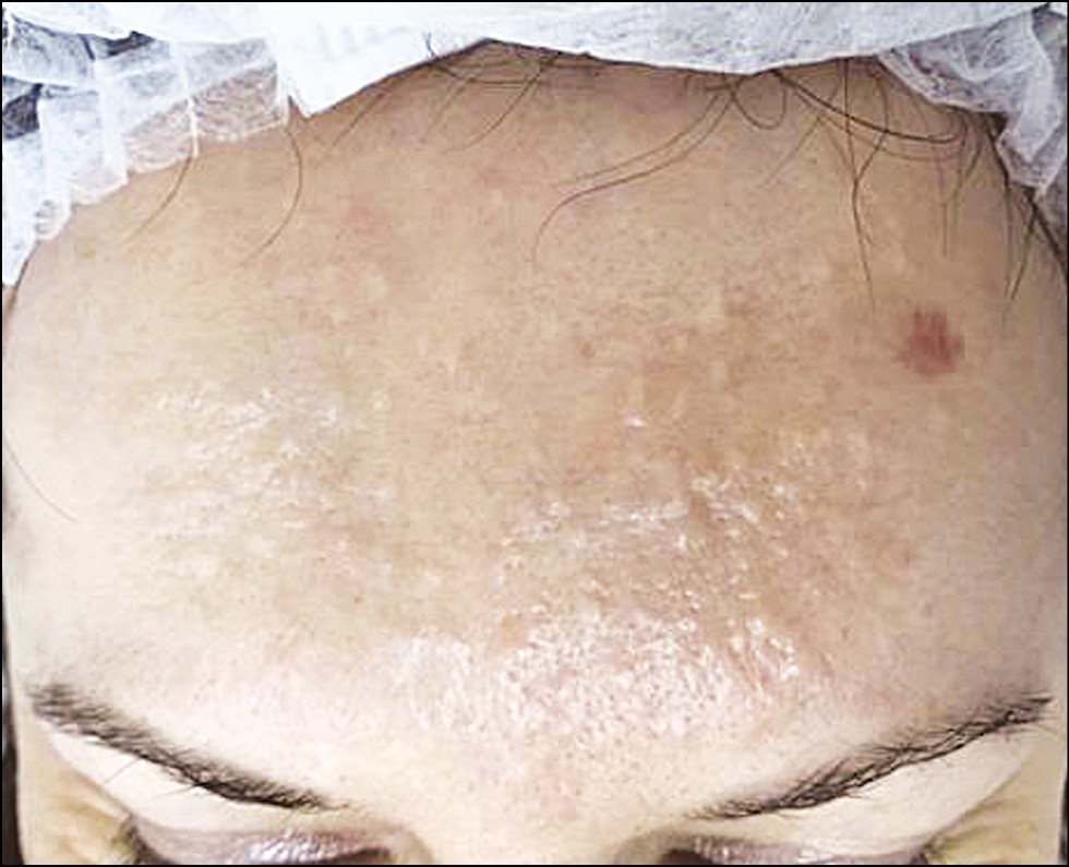 Женщина С., 34 года, обратилась в клинику с жалобами на множественные высыпания на коже лба, которые доставляют беспокойство с косметической точки зрения, субъективно не беспокоят. Появление первых высыпаний впервые отметила около двух лет назад, постепенно их количество увеличивалось. Обращалась к косметологу, получала лечение в виде пилингов различной интенсивности без эффекта. При обращении к дерматологу наблюдалась с диагнозом множественных аденом, лечение не получала. В настоящее время отмечает прогрессирование процесса и увеличение количества высыпаний.