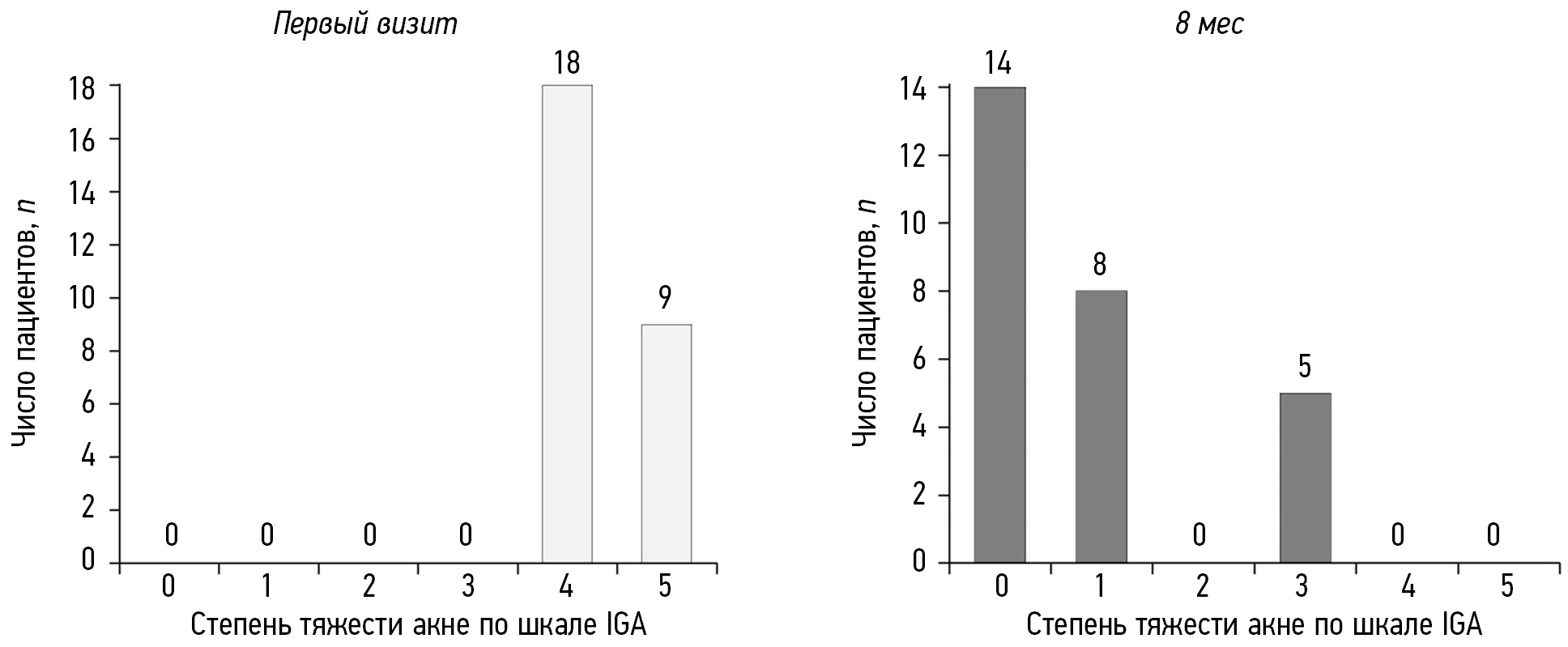 К 8-му мес (Д4) у 22 (81,4%) пациентов наблюдалась чистая или почти чистая кожа по шкале IGA, присутствовали поствоспалительная гиперпигментация и рубцы (рис. 1). У 3 (11,1%) пациентов помимо симптомокомплекса постакне присутствовали единичные небольшие уплотнения в области щёк. Индекс ДИКЖ соответствовал 4,3±1,2 баллам, демонстрируя тем самым улучшение на 74,9% по сравнению с изначальным уровнем (рис. 2). Доля пациентов, достигнувших за время исследования двухбалльного снижения степени по шкале IGA (n=22), составляла 81,4%. Средние значения ДИА на каждом из визитов, которые демонстрируют выраженное клиническое улучшение на фоне проводимой терапии, представлены на рис. 3. Количество воспалительных и невоспалительных элементов за время исследования сократилось с 91,4% для узлов до 98,3% для пустул (рис. 4).