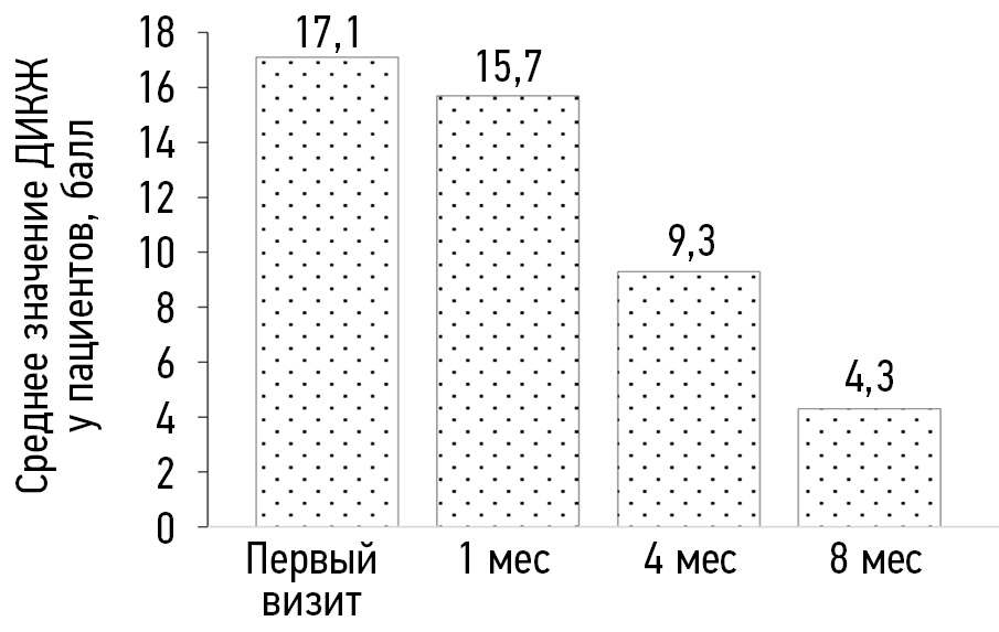 Рис. 2. Динамика изменения дерматологического индекса качества жизни (ДИКЖ) на фоне проводимой терапии. / Fig. 2. Dynamics of changes of the Dermatological index of quality of life (DQLI) during therapy.