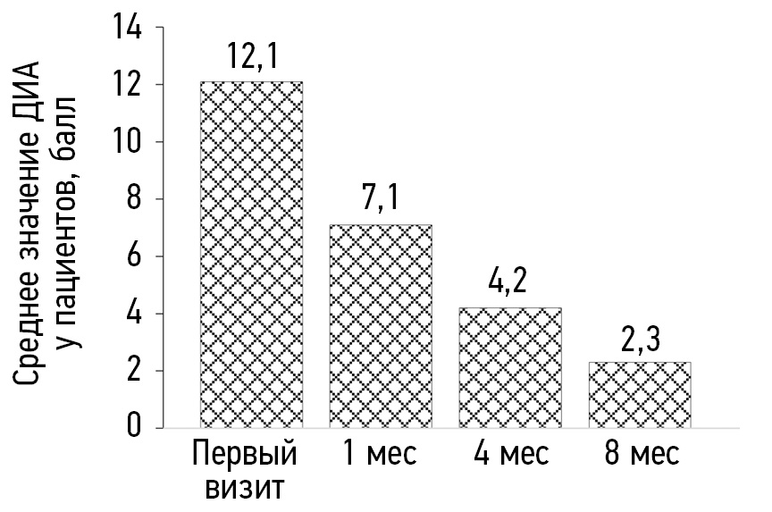 Рис. 3. Динамика изменения дерматологического индекса акне (ДИА) на фоне проводимой терапии. / Fig. 3. Dynamics of changes of the Dermatological index of acne (DIA) during therapy.